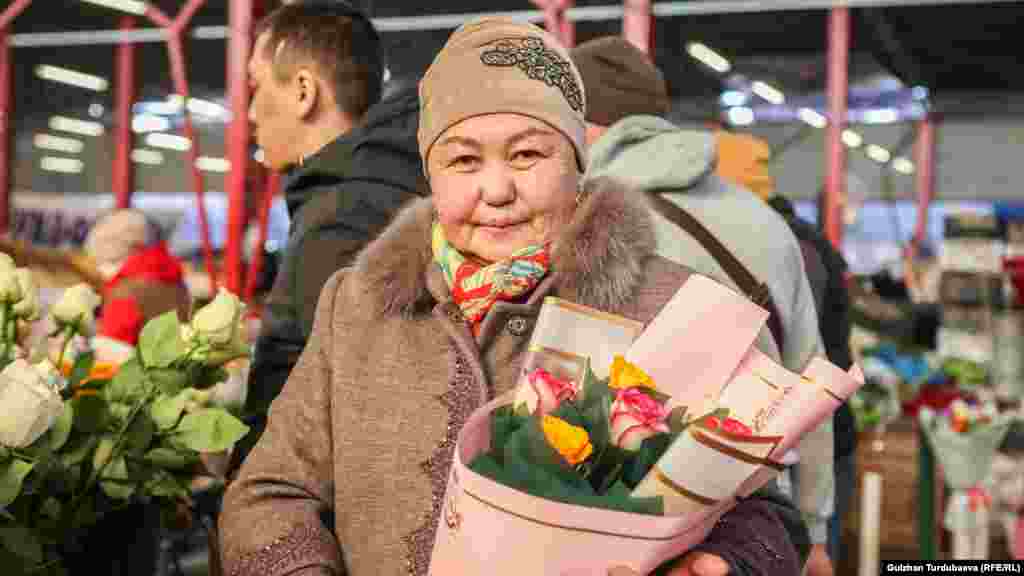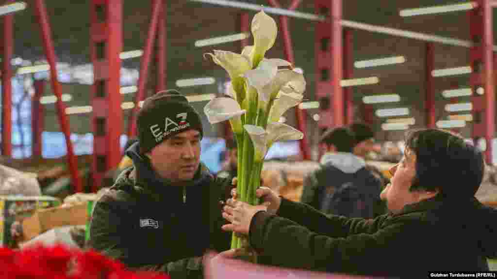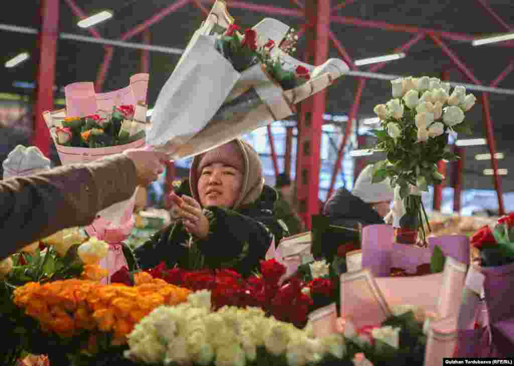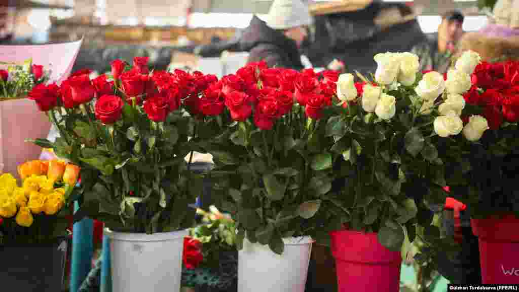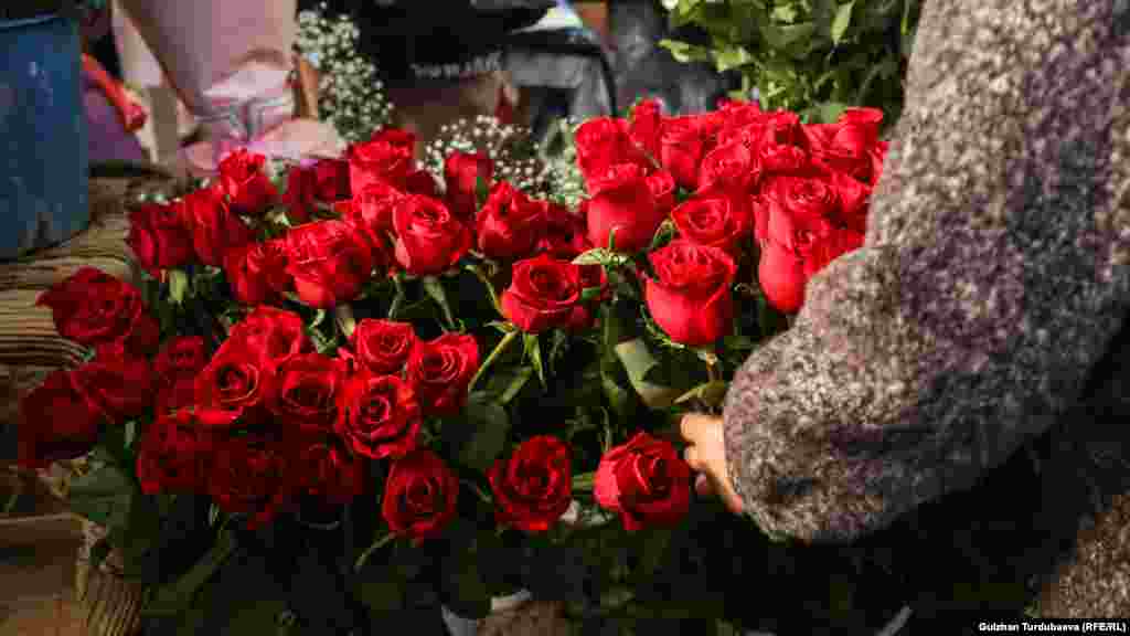 Ош базардын так ортосунда жайгашкан гүл базарда акыркы эки күндө соода кызыды. Базарда бир даана роза түрүнө жараша 120 сомдон, 170 сомго чейин сатылса, жоогазындардын баасы 120 сомдон башталат. Каалоочулар үчүн сатуучулар кооз букет да жасап беришет.