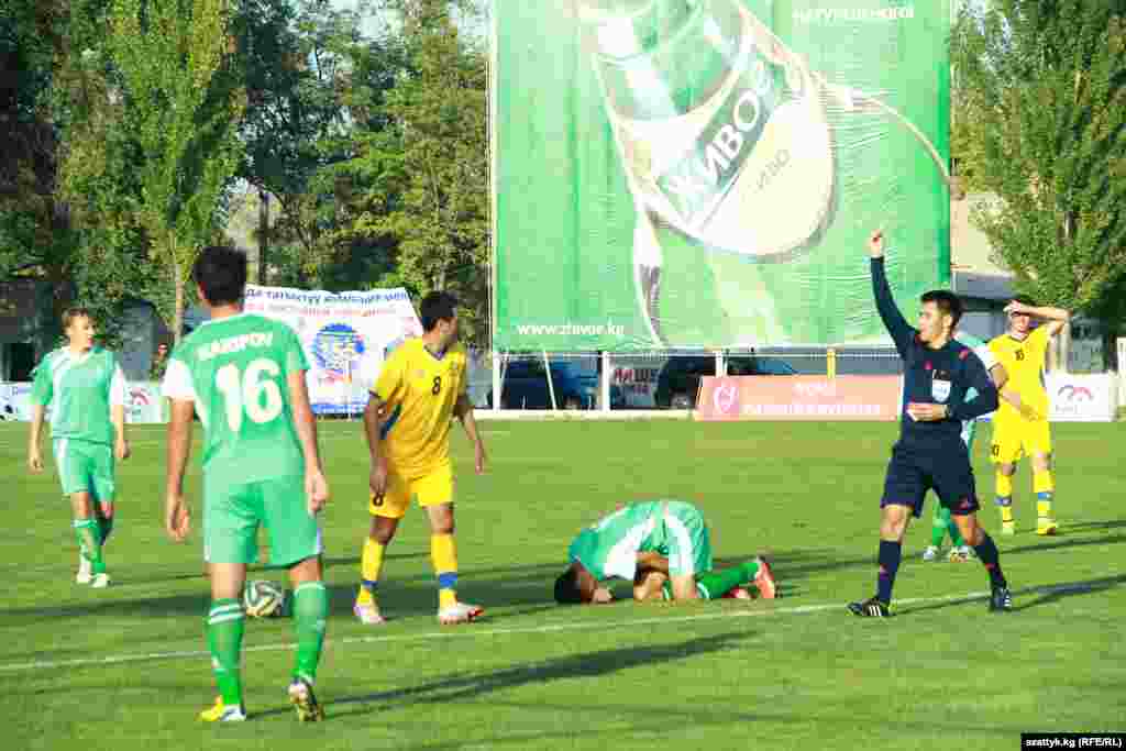 Оюндун 18-мүнөтүнөн баштап талаа кожоюндары 1 оюнчуга кем ойноого аргасыз болушту. «Дордойчу» Даврон Аскаровду буттан чалып одоно оюн көрсөткөндүгү үчүн мелдештин башкы калысы Рысбек Шекербеков «Абдыш-Ата» оюнчусу Марат Ажиниязовго кызыл айып кагазын көрсөтүп, оюндан чыгарды.