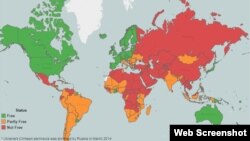 "Фридом Хаус" сөз эркиндиги өтө начар 10 өлкөнүн жана аймактын катарында Беларусту, Орусия бөлүп кеткен Крымды, Иран менен Түркмөнстанды жана Өзбекстанды атады.